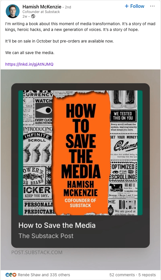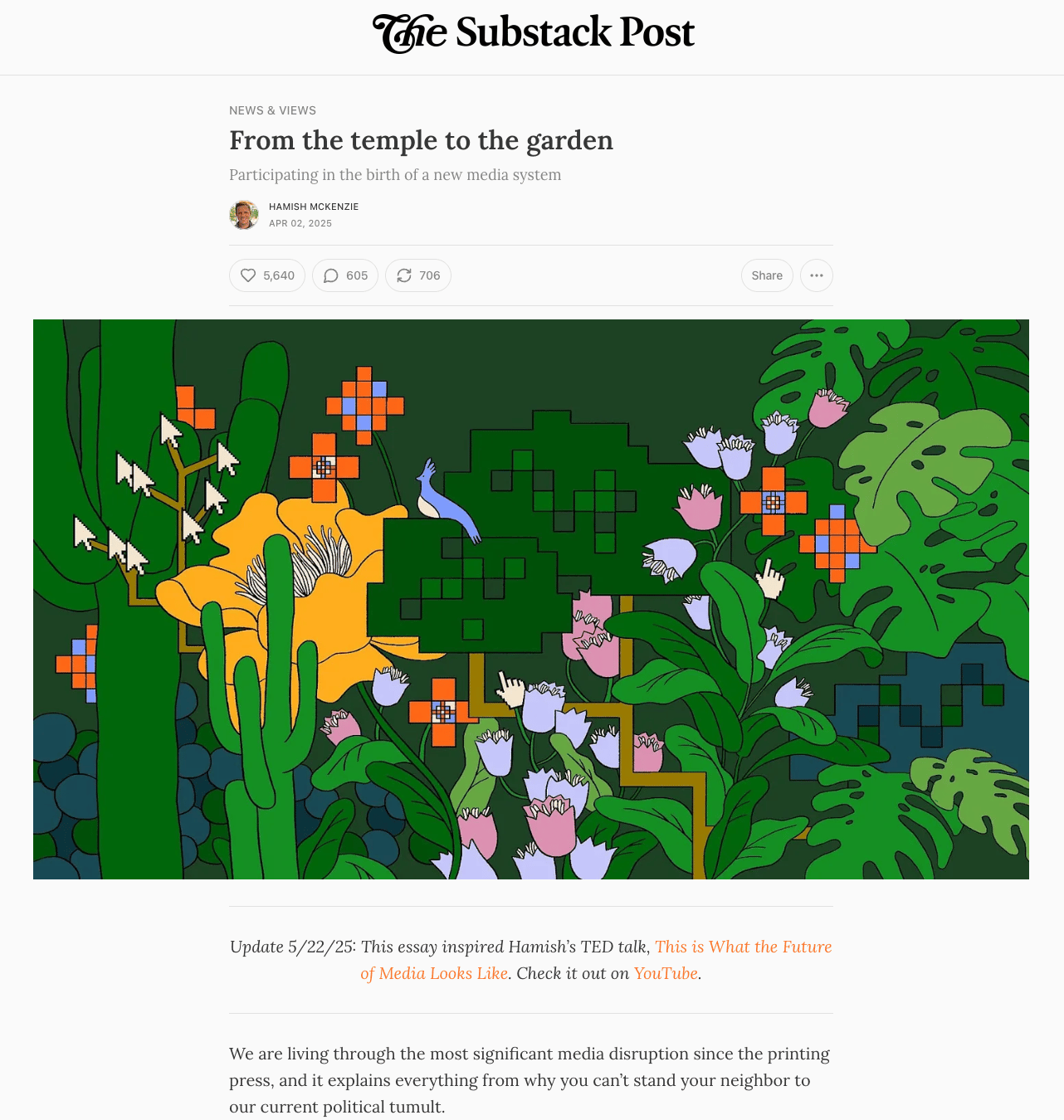 Hamish announced his upcoming book '‘How to Save the Media’ on LinkedIn a couple of weeks ago. He backed up his thesis behind chronicling the status quo of traditional media and journalism in 2026 with his essay (which also led to a TED Talk) in Apr 2025 ‘From the temple to the garden’. In this essay, he had beautifully illustrated the way the media landscape has evolved, and how we are only beginning to realize the potential behind democratizing online media platforms.
