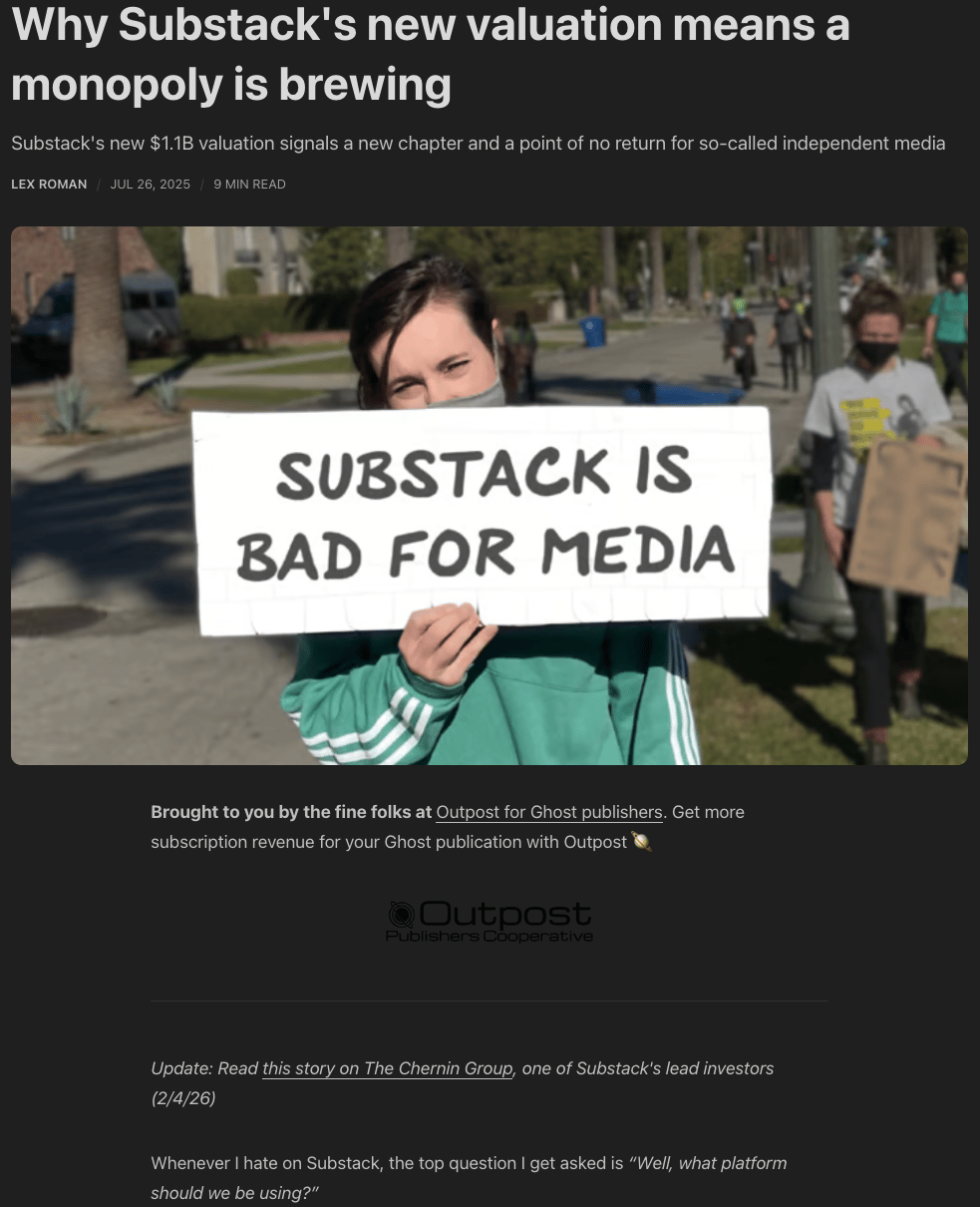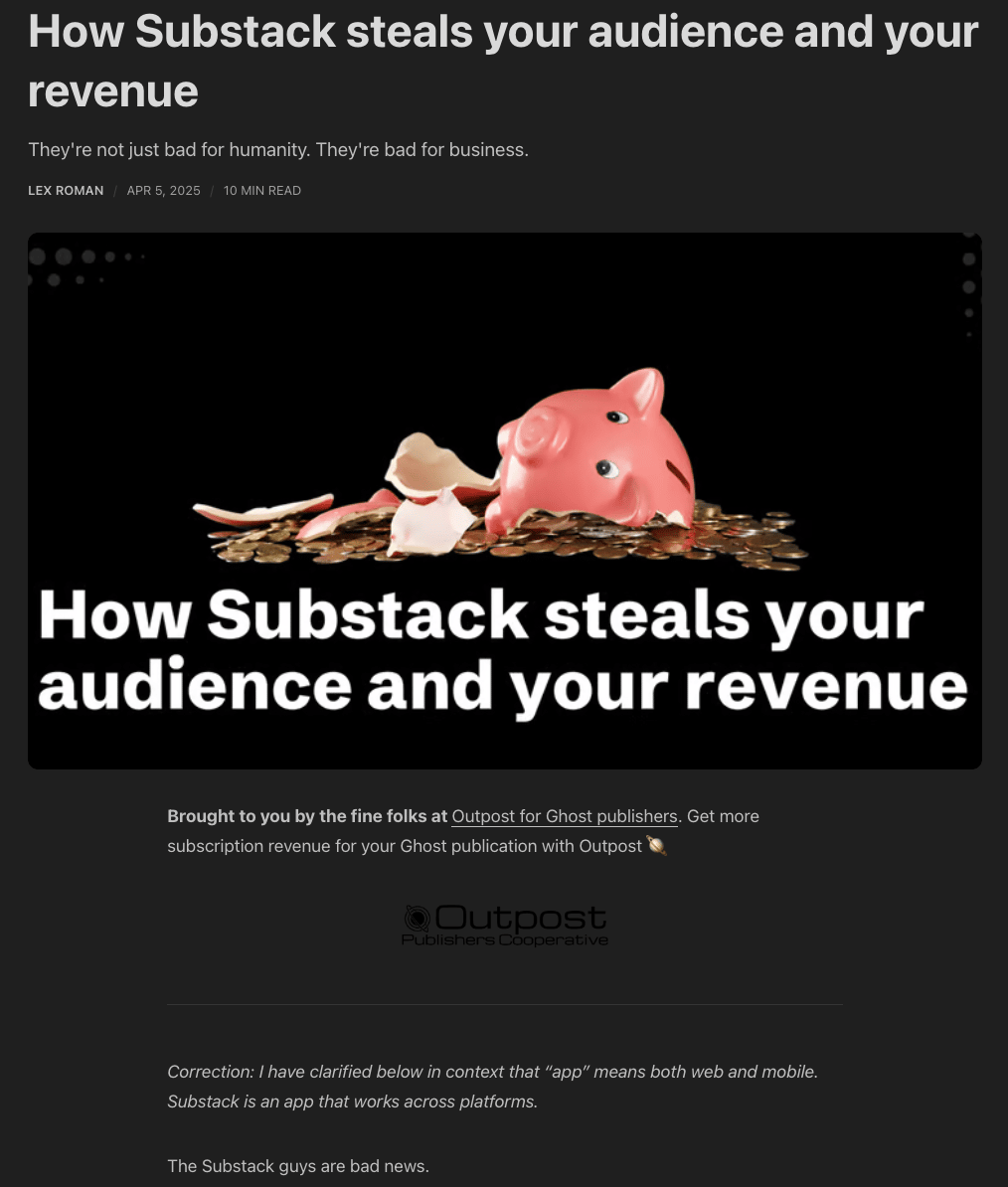 Because for all the good work that people like Lex are putting together, there are not enough amplifying voices out there, which can help you discern the difference between Substack and other newsletter platforms like Beehiiv and Ghost, which offer a fairer deal to independent writers in comparison.