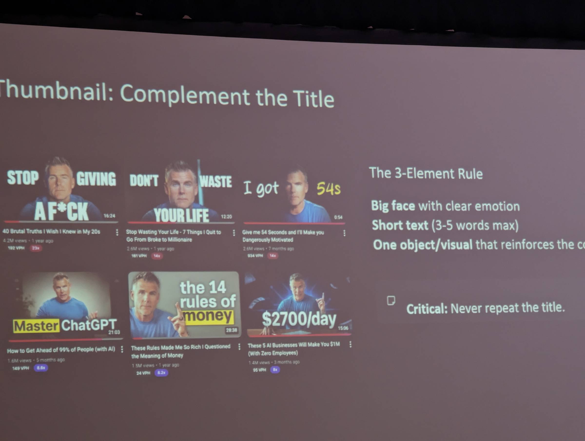 Alright, enough of fun, let’s get down to business. Matt had such a stellar lineup of guests for his talks, and he started the conference with a fiery speaker - Anik Singal. Anik unveiled his entire playbook on how he used AI-driven video content to propel his brand on YT and socials. It was a hot take, but it was the perfect conversation-starter for the conference.