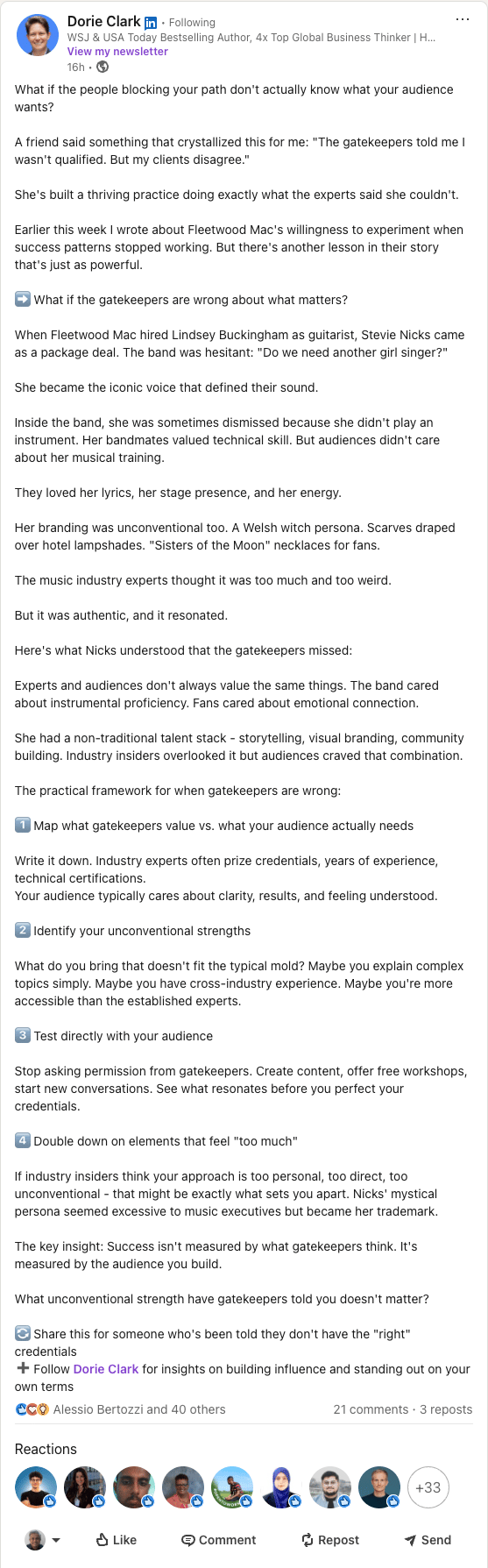 The reason I am talking about Dorie Clark today is her LinkedIn post this week struck a chord with me, particularly this line: