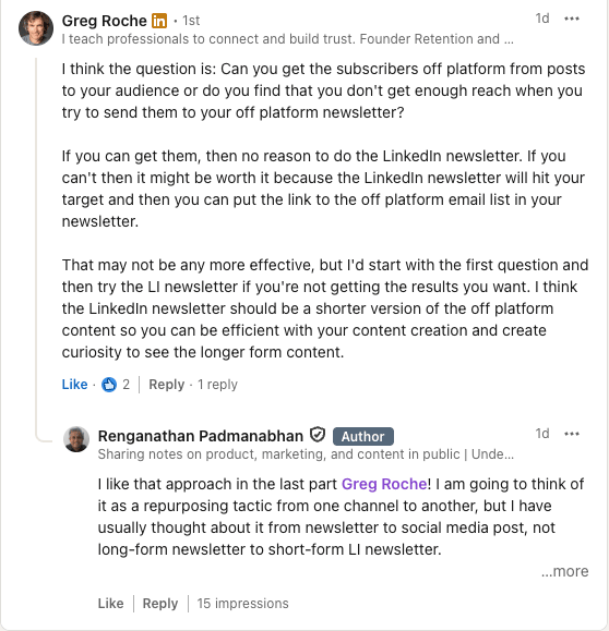 ​Greg Roche (who hangs out in the same community as I do) suggested that we consider LinkedIn newsletters to be the teaser/lead magnet to the long-form email newsletter, and then use a ‘Read More’ to get them to your site where your newsletter is hosted, thus providing an off-ramp to your email content.