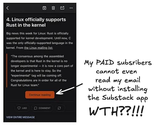 George Orosz, who writes ‘The Pragmatic Engineer’ newsletter with more than 1 million subscribers, dropped a Substack note this week that his email content was truncated by the Substack platform with a Call-to-Action button saying ‘Continue Reading’ which redirected to Substack’s mobile app.