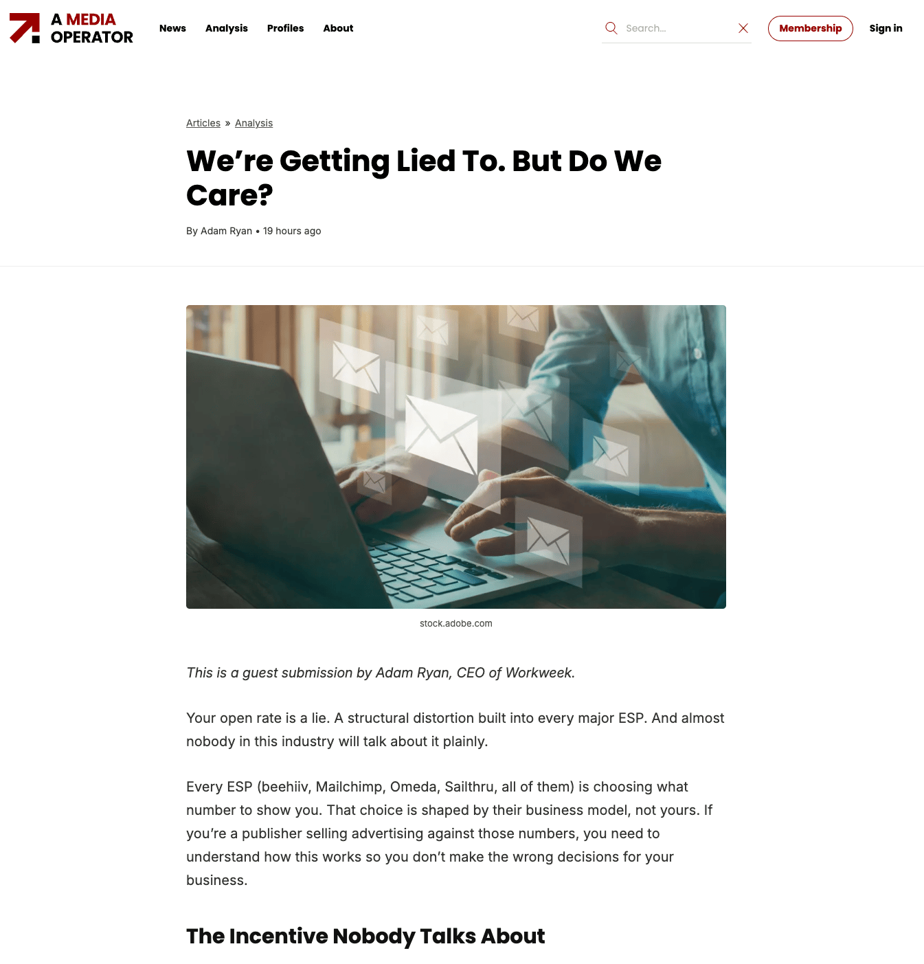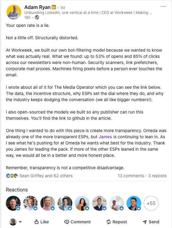 Across its newsletter portfolio, Workweek does millions of email sends in a given month. So understanding what’s happening across the board and who’s opening their emails is the prime imperative for Adam, and I would argue, for any publisher or advertiser. Since they are the ones living, and paying a ransom, by that metric.